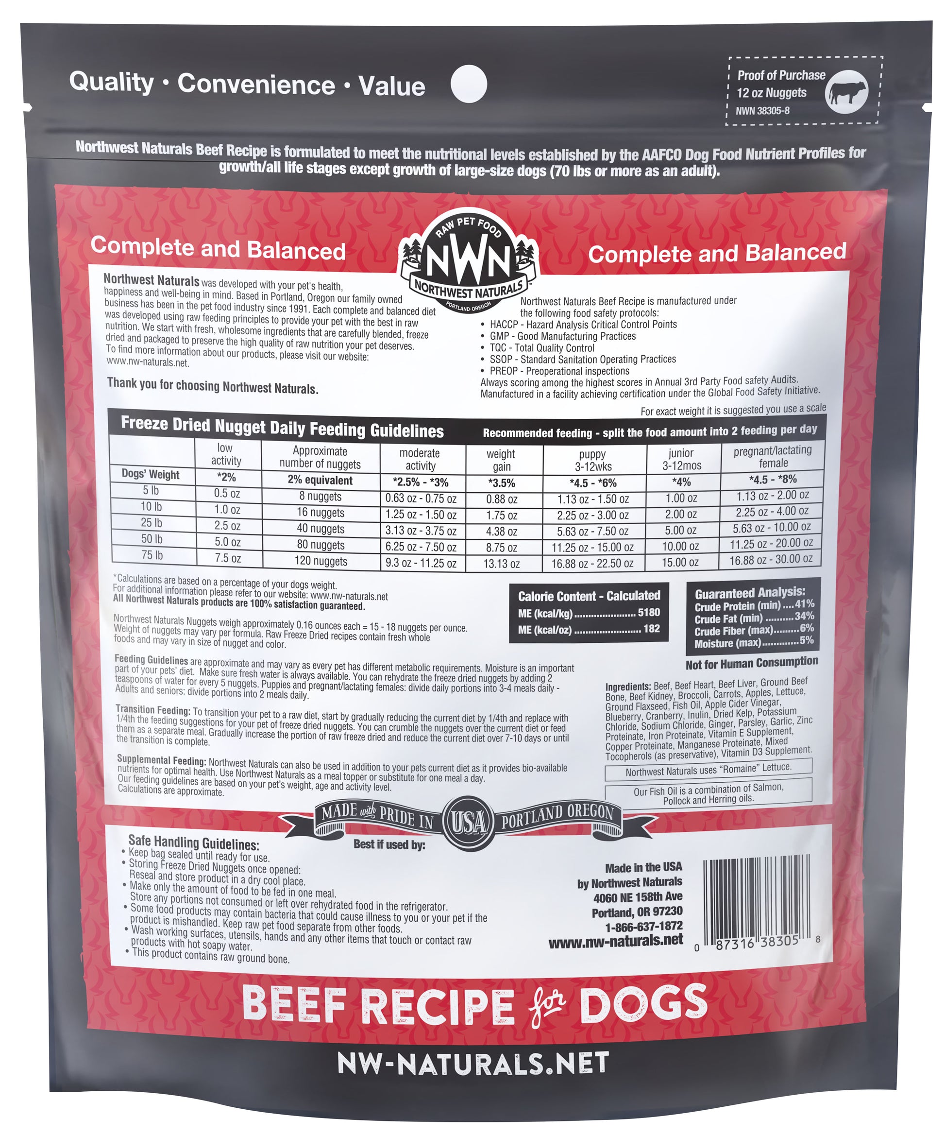 Northwest Naturals Beef is formulated to meet the nutritional levels established by the AAFCO Dog Food Nutrient Profiles for growth/all life stages except for growth of large-sized dogs (70lbs or more as an adult).