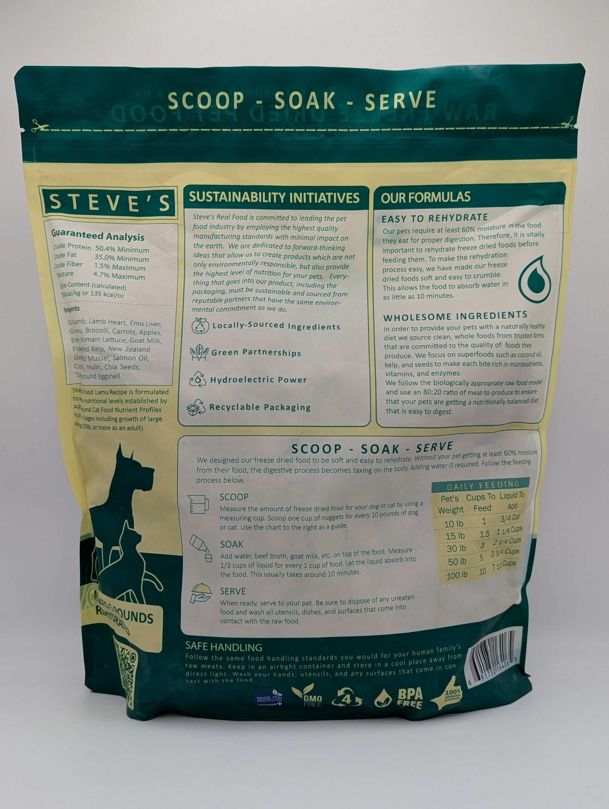 Steve's Real Food Lamu is a delicious freeze-dried raw dog food made with lamb and emu meat. Lamb is a novel protein that creates mealtime excitement for picky eaters, and it's easily digestible for pets with sensitive stomachs. Emu, also considered a novel protein, is a lean red meat. The American Heart Association recognizes emu meat as a healthy alternative to beef, with a higher count of iron, protein, and vitamin C and lower in cholesterol, fat, and calories. Freeze-dried Lamu is complete and balanced for all stages of life and can be fed to dogs and cats.