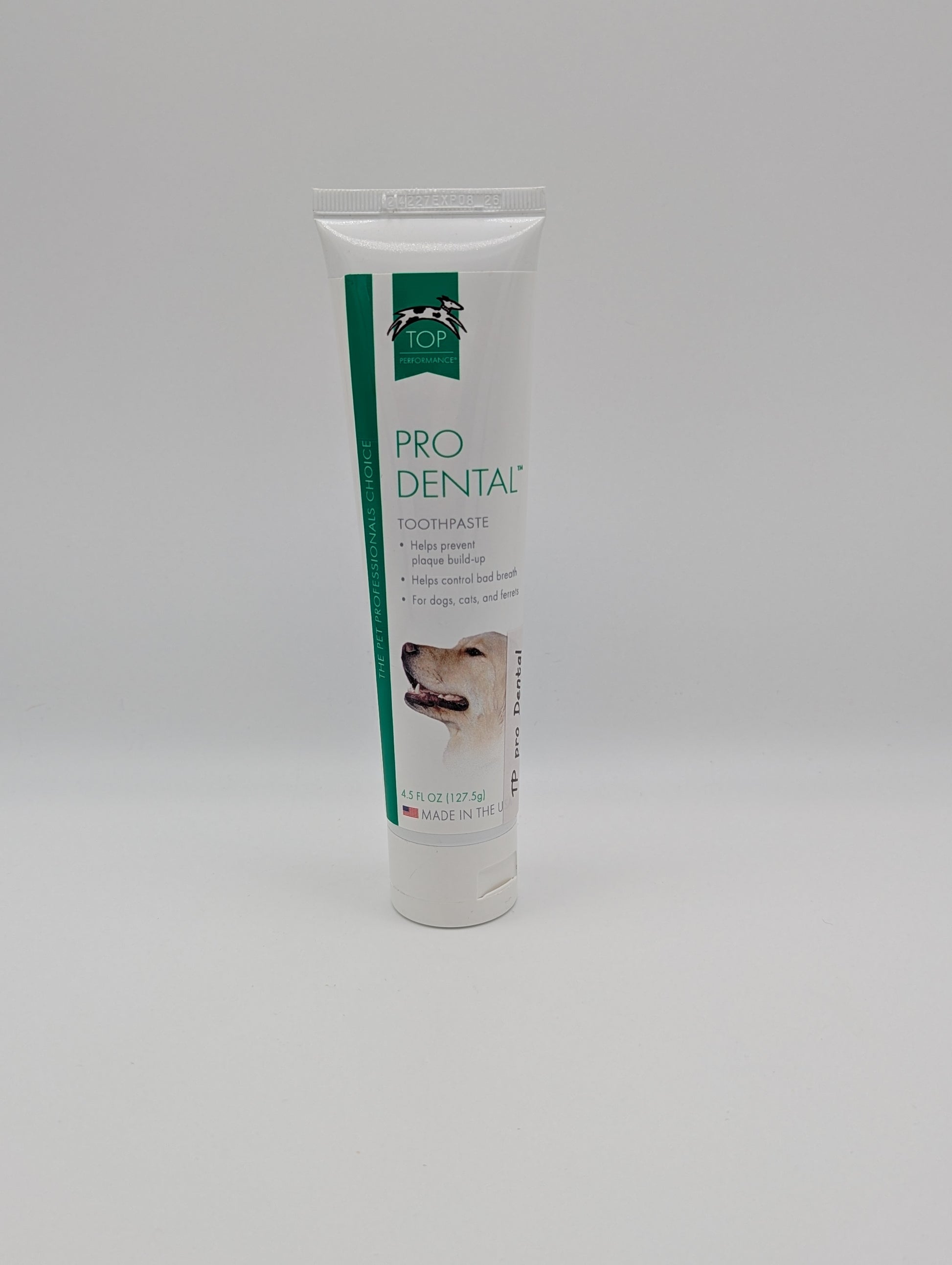Top Performance ProDental Toothpaste (4.5oz) is specially formulated to promote your pet's oral health. Its gentle, effective formula helps reduce plaque, tartar, and bad breath, keeping your dog or cat's teeth clean and gums healthy. Safe and easy to use, it's the perfect addition to your pet's dental care routine!